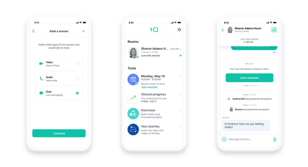 - When it’s time to book your next session in the Talkspace app, you will have the chance to select which format you prefer: video, audio, or live chat. Select “Chat,” and your session is booked.