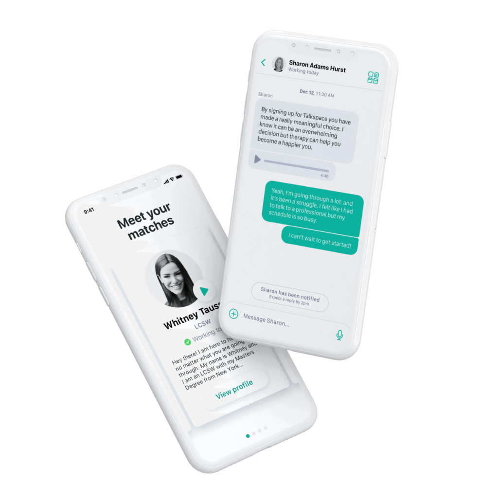 Flexibility at Talkspace shows up across your entire journey — from helping you find the right plan that fits your needs, to matching you with the right therapist, to providing you with consistent, convenient access to quality mental health care via the Talkspace app. Talkspace is available on your smartphone, iOS or Android, and can also be reached from your desktop or laptop computer web browser.